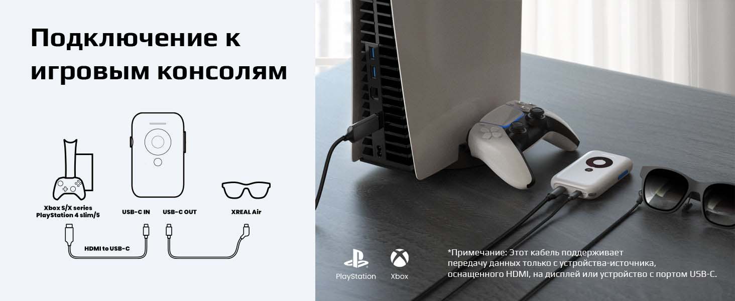 - Предназначен для подключения PlayStation, Xbox и любого другого устройства с выходом HDMI к XREAL Beam;