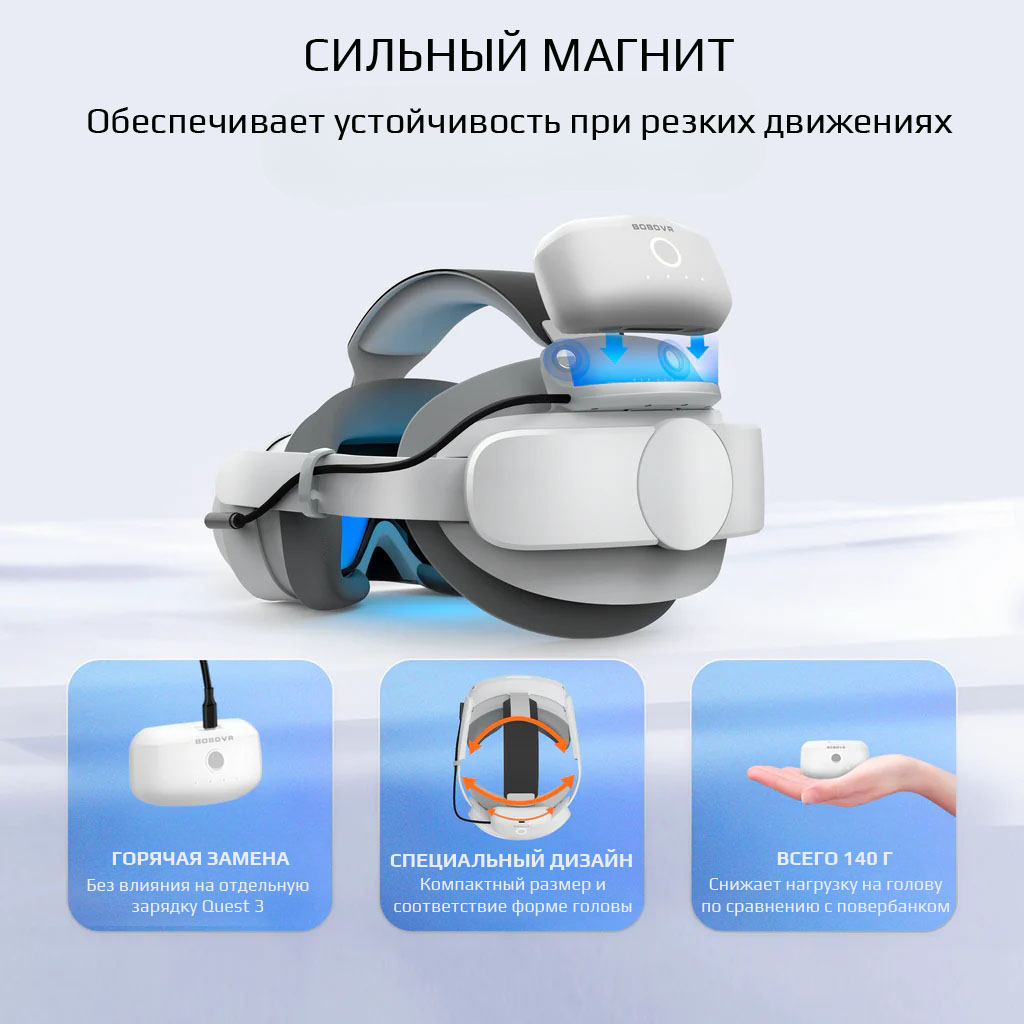 Аккумулятор B2 (5200 мАч) с фирменной технологией магнитной горячей замены BOBOVR позволяет легко менять батарею даже во время игры. Активируется аккумулятор при подключении, обеспечивая бесперебойную подачу питания и удобное управление зарядом.