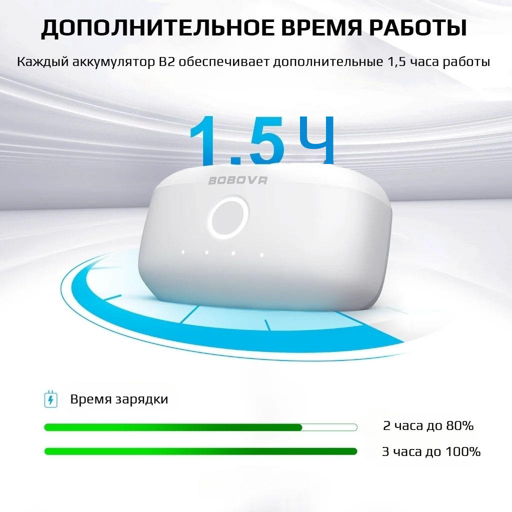 Аккумулятор увеличивает время работы PICO 4 Ultra примерно на 65%. Для достижения максимальной эффективности рекомендуется заряжать устройство до уровня выше 50% перед использованием с аккумулятором B2.
