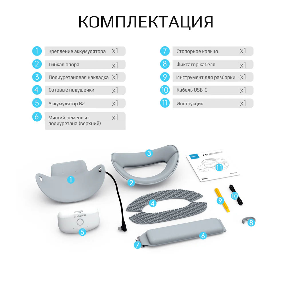 BOBOVR P4S — это комплект для модернизации, специально разработанный для PICO 4 Ultra. Он включает съемный аккумулятор, усиленную заднюю опору и улучшенный верхний ремень для максимального комфорта и длительных игровых сессий.