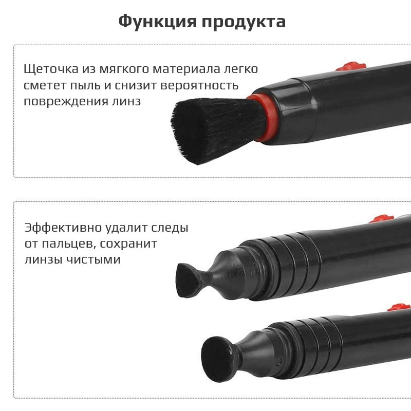 Устройство двустороннее: с одной стороны расположен мягкий наконечник для обеспыливания, с другой — угольная щеточка для удаления следов от пальцев. Кнопка в середине позволяет выбрать тип щетки для удобного очищения линзы.