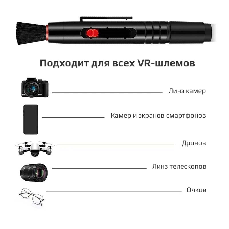 — страна производстваКупив устройство для очистки линз (Cleaning Pen) 2 в 1 с угольным наконечником, вы легко сотрете следы от пальцев, пыль и жирные пятна и обеспечите защиту своих устройств виртуальной реальности.Теперь во время игры вы будете развлекаться, не боясь повредить линзы своей техники.