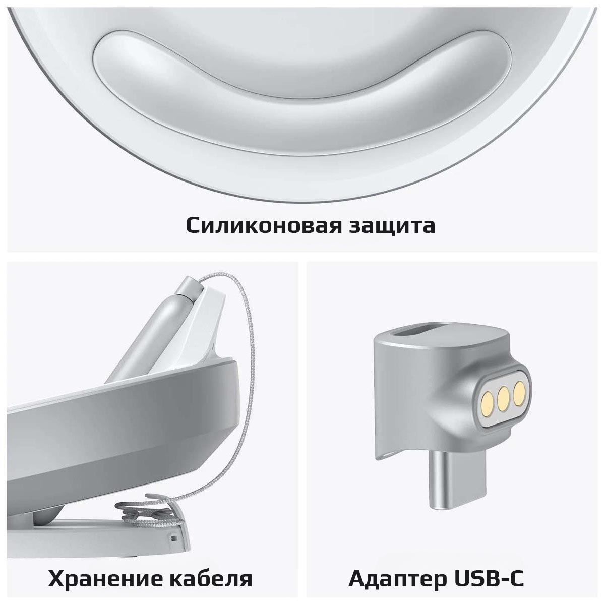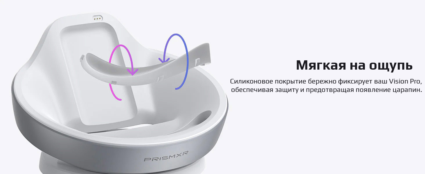 Мягкая на ощупь: Зарядная станция с силиконовым покрытием обеспечивает невероятно мягкую поверхность для размещения Vision Pro и его аккумулятора, защищая их от царапин.