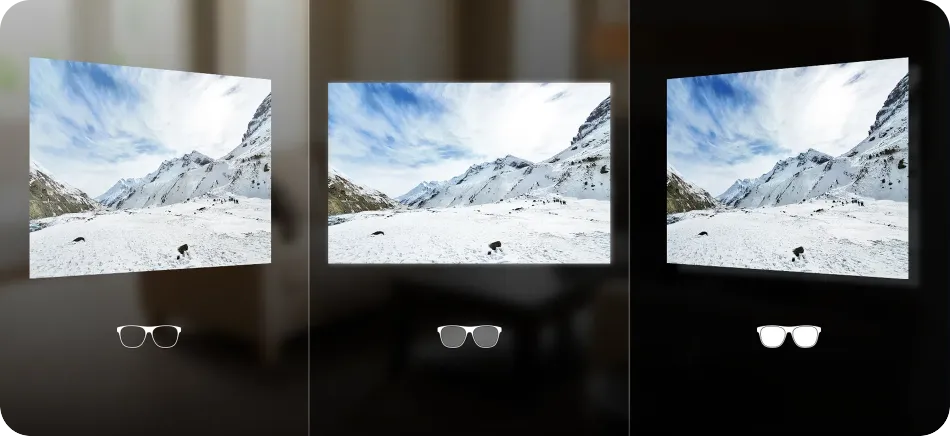 • Smart Transparency Switching — при необходимости вы можете вручную выбрать режим: полностью прозрачный (как обычные очки), полупрозрачный (для работы) или полностью непрозрачный (для кино).