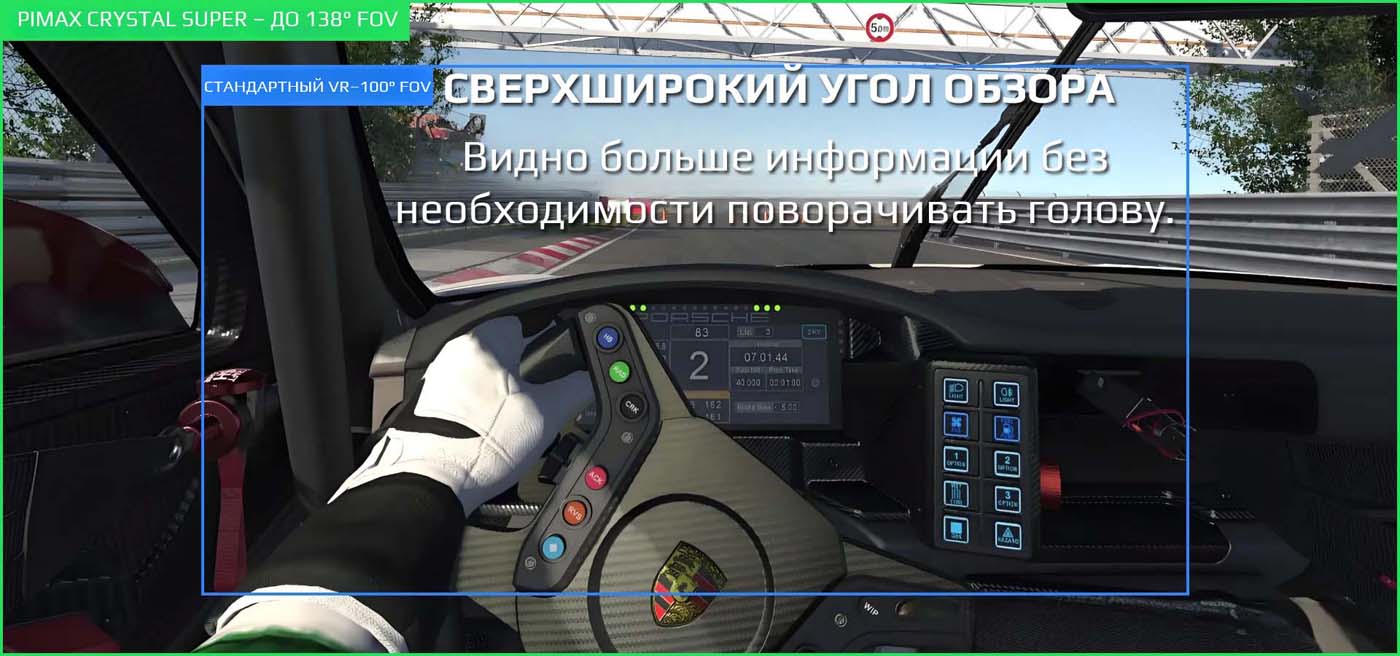 Стандартные VR-шлемы ограничены примерно 100° FOV, что сужает обзор. Pimax Crystal Super Ultrawide предлагает угол обзора до 138°, что позволяет охватывать больше информации без постоянных поворотов головы. Это особенно важно для авиасимуляторов, гонок и шутеров, где периферийное зрение играет ключевую роль.